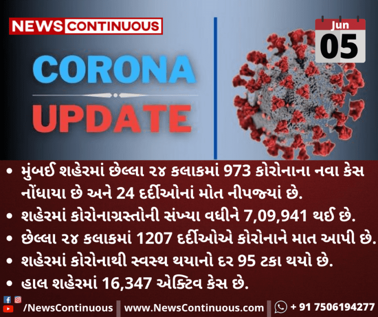 મુંબઈ શહેરમાં છેલ્લા ૨૪ કલાકમાં 973 કોરોનાના નવા કેસ નોંધાયા છે અને 24 દર્દીઓનાં મોત નીપજ્યાં છે.