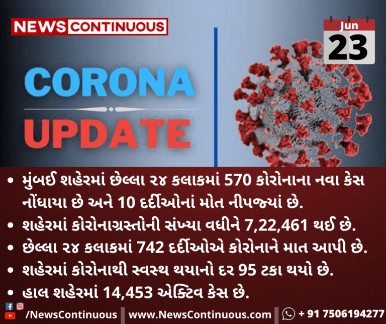 મુંબઈ શહેરમાં છેલ્લા ૨૪ કલાકમાં 570 કોરોનાના નવા કેસ નોંધાયા છે અને 10 દર્દીઓનાં મોત નીપજ્યાં છે.
