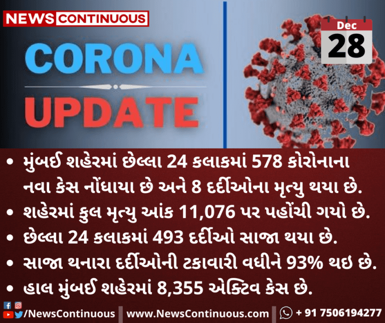 મુંબઈ શહેરમાં છેલ્લા 24 કલાકમાં 578 કોરોનાના નવા કેસ નોંધાયા છે અને 8 દર્દીઓના મૃત્યુ થયા છે.