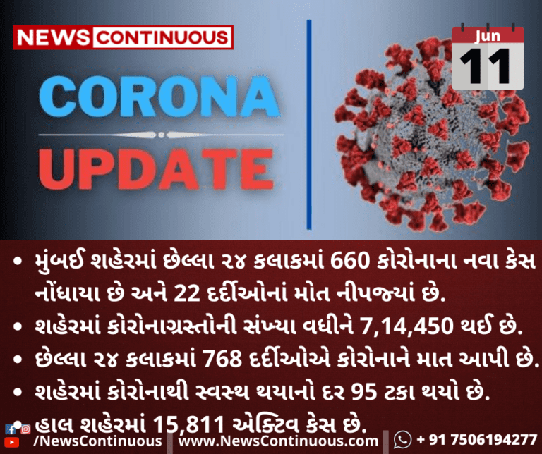 મુંબઈ શહેરમાં છેલ્લા ૨૪ કલાકમાં 660 કોરોનાના નવા કેસ નોંધાયા છે અને 22 દર્દીઓનાં મોત નીપજ્યાં છે.