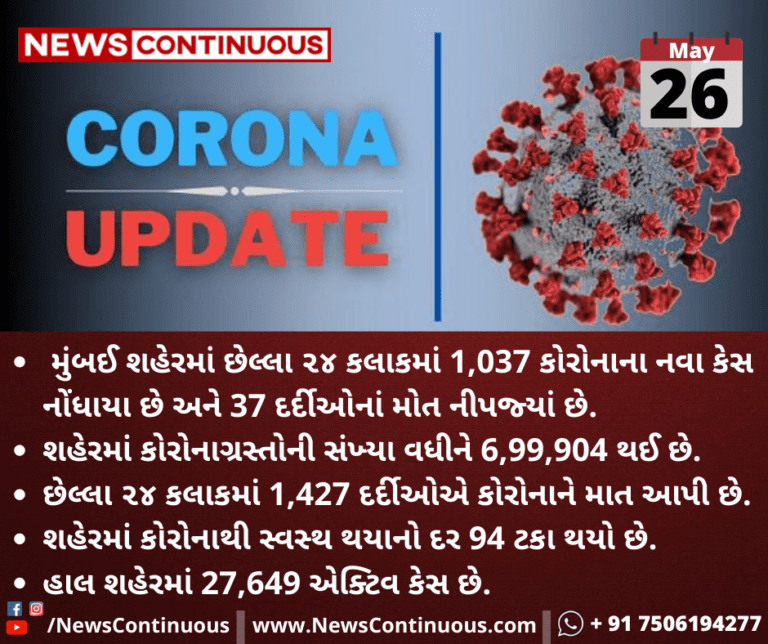 મુંબઈ શહેરમાં છેલ્લા ૨૪ કલાકમાં 1,037 કોરોનાના નવા કેસ નોંધાયા છે અને 37 દર્દીઓનાં મોત નીપજ્યાં છે.