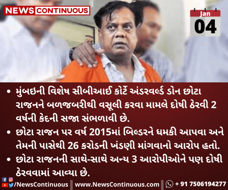 મુંબઇની વિશેષ સીબીઆઈ કોર્ટે અંડરવર્લ્ડ ડોન છોટા રાજનને બળજબરીથી વસૂલી કરવા મામલે દોષી ઠેરવી 2 વર્ષની કેદની સજા સંભળાવી છે.