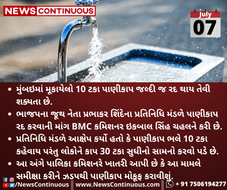 મુંબઇ(Mumbai)માં મૂકાયેલો 10 ટકા પાણીકાપ જલ્દી જ રદ થાય તેવી શક્યતા છે
