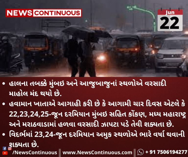હવામાન ખાતાએ આગાહી કરી છે કે આગામી ચાર દિવસ એટલે કે 22,23,24,25-જૂન દરમિયાન મુંબઇ સહિત કોંકણ, મધ્ય મહારાષ્ટ્ર અને મરાઠવાડામાં હળવા વરસાદી ઝાપટા પડે તેવી શક્યતા છે.