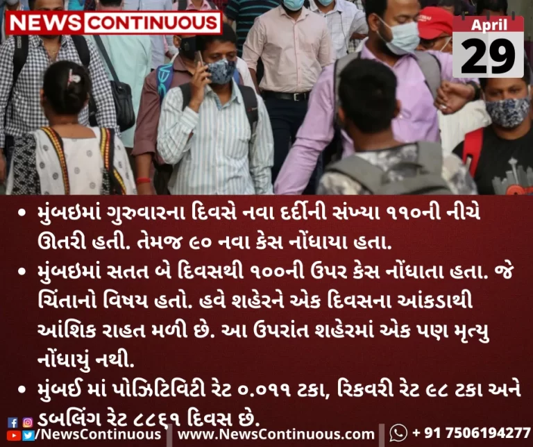 મુંબઇમાં સતત બે દિવસથી ૧૦૦ની ઉપર કેસ નોંધાતા હતા. જે ચિંતાનો વિષય હતો. હવે શહેરને એક દિવસના આંકડાથી આંશિક રાહત મળી છે. આ ઉપરાંત શહેરમાં એક પણ મૃત્યુ નોંધાયું નથી.