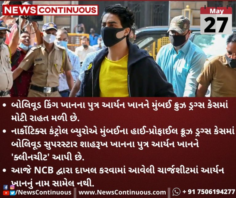 નાર્કોટિક્સ કંટ્રોલ બ્યુરોએ(NCB) મુંબઈના હાઈ-પ્રોફાઈલ ક્રૂઝ ડ્રગ્સ કેસમાં બોલિવૂડ સુપરસ્ટાર(Bollywood superstar) શાહરૂખ ખાનના(Shah Rukh Khan) પુત્ર આર્યન ખાનને 'ક્લીનચીટ'(Cleanchit) આપી છે.