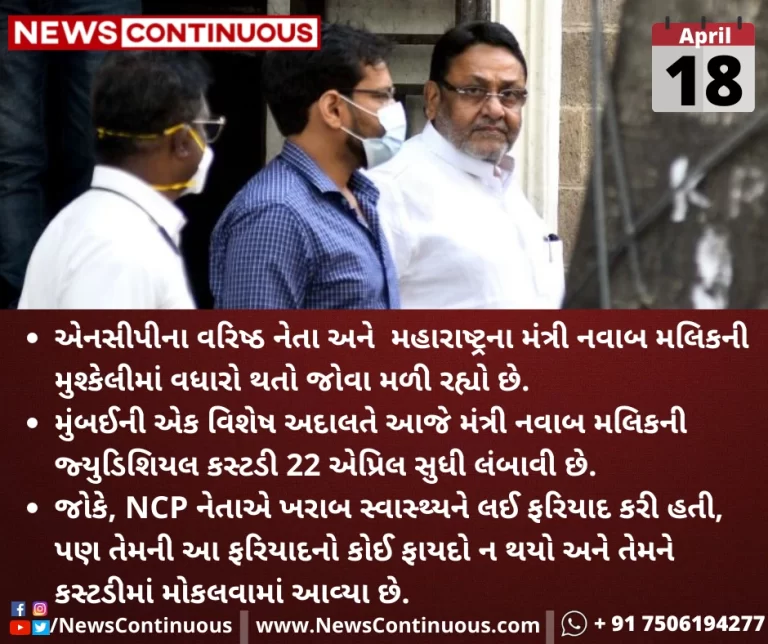 મુંબઈની એક વિશેષ અદાલતે(Special Court) આજે મંત્રી નવાબ મલિકની જ્યુડિશિયલ કસ્ટડી(Judicial Custody) 22 એપ્રિલ સુધી લંબાવી છે.