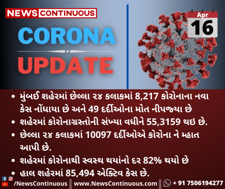 મુંબઈ શહેરમાં છેલ્લા ૨૪ કલાકમાં 8,217 કોરોનાના નવા કેસ નોંધાયા છે અને 49 દર્દીઓના મોત નીપજ્યા છે