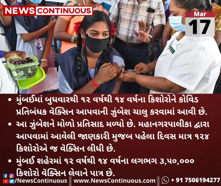 મુંબઈમાં બુધવારથી ૧૨ વર્ષથી ૧૪ વર્ષના કિશોરોને કોવિડ પ્રતિબંધક વૅક્સિન આપવાની ઝુંબેશ ચાલુ કરવામાં આવી છે.