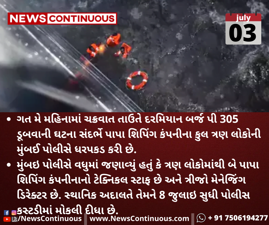 ગત મે મહિનામાં ચક્રવાત તાઉતે દરમિયાન બર્જ પી 305 ડૂબવાની ઘટના સંદર્ભે પાપા શિપિંગ કંપનીના કુલ ત્રણ લોકોની મુંબઈ પોલીસે ધરપકડ કરી છે.
