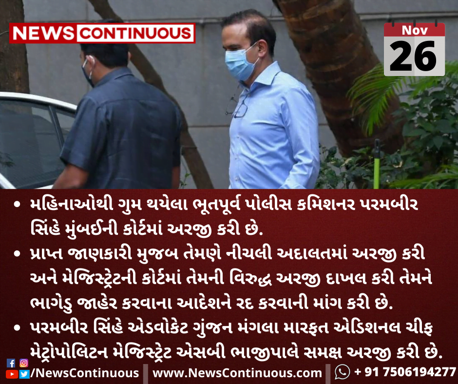 મહિનાઓથી ગુમ થયેલા ભૂતપૂર્વ પોલીસ કમિશનર પરમબીર સિંહે મુંબઈની કોર્ટમાં અરજી કરી છે.
