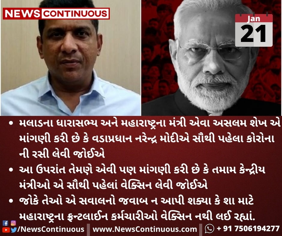 મલાડના ધારાસભ્ય અને મહારાષ્ટ્રના મંત્રી એવા અસલમ શેખ એ માંગણી કરી છે કે વડાપ્રધાન નરેન્દ્ર મોદીએ સૌથી પહેલા કોરોના ની રસી લેવી જોઈએ