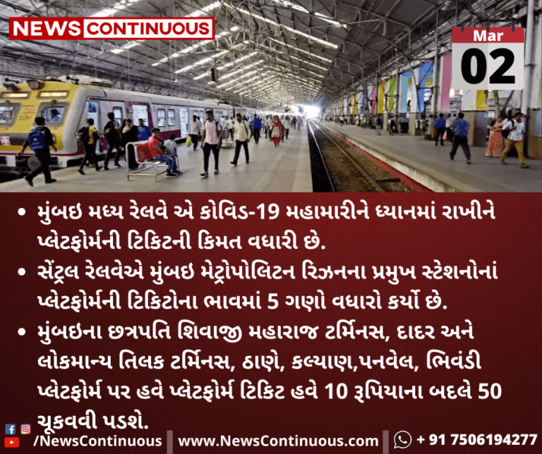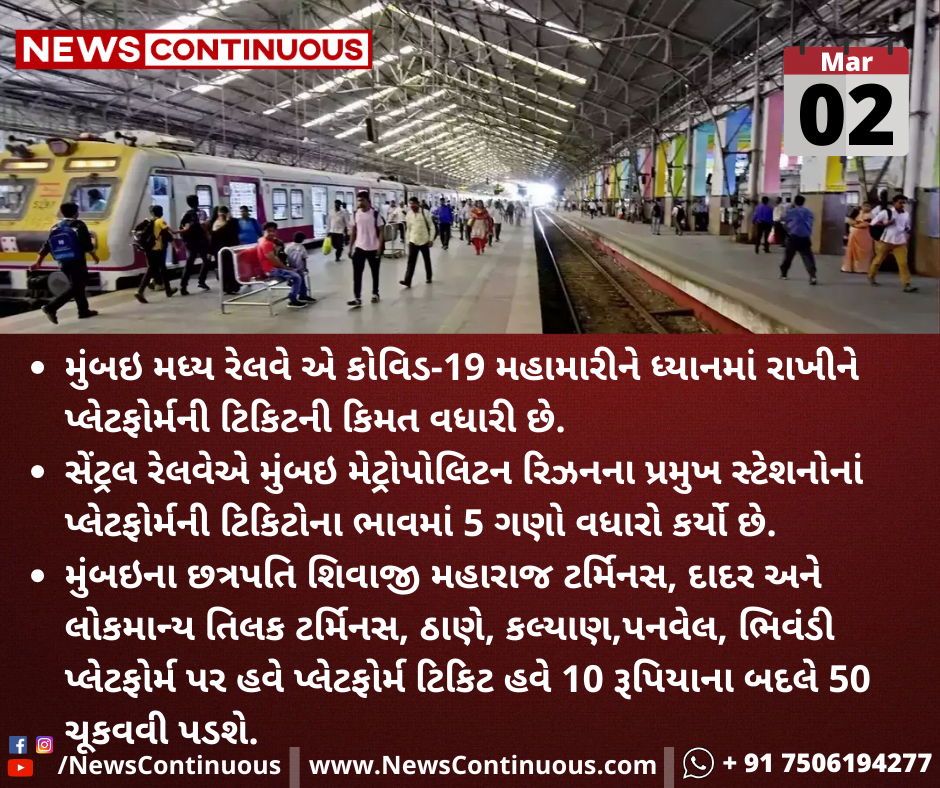 મુંબઇ મધ્ય રેલવે એ કોવિડ-19 મહામારીને ધ્યાનમાં રાખીને પ્લેટફોર્મની ટિકિટની કિમત વધારી છે. સેંટ્રલ રેલવેએ મુંબઇ મેટ્રોપોલિટન રિઝનના પ્રમુખ સ્ટેશનોનાં પ્લેટફોર્મની ટિકિટોના ભાવમાં 5 ગણો વધારો કર્યો છે.