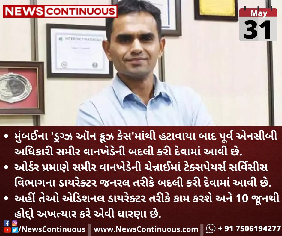 ઓર્ડર પ્રમાણે સમીર વાનખેડેની ચેન્નાઈમાં(Chennai) ટેક્સપેયર્સ સર્વિસીસ વિભાગના(Department of Taxpayers Services) ડાયરેક્ટર જનરલ(Director General) તરીકે બદલી કરી દેવામાં આવી છે.