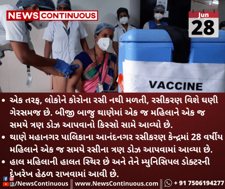 થાણે મહાનગર પાલિકાના આનંદનગર રસીકરણ કેન્દ્રમાં 28 વર્ષીય મહિલાને એક જ સમયે રસીના ત્રણ ડોઝ આપવામાં આવ્યા છે.