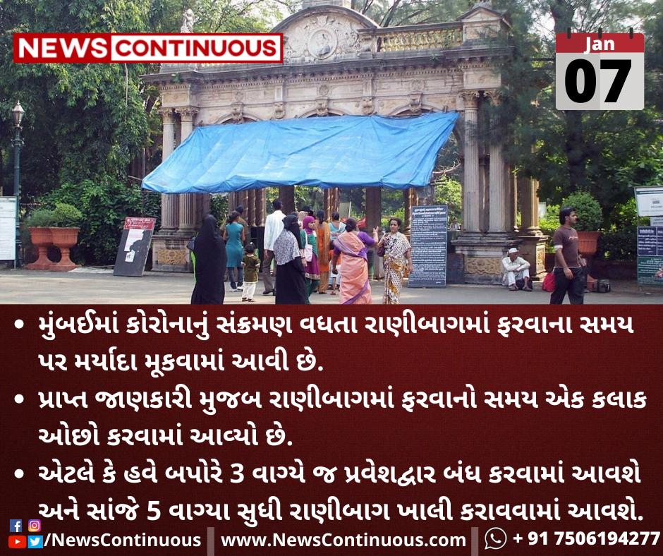 મુંબઈમાં કોરોનાનું સંક્રમણ વધતા રાણીબાગમાં ફરવાના સમય પર મર્યાદા મૂકવામાં આવી છે.