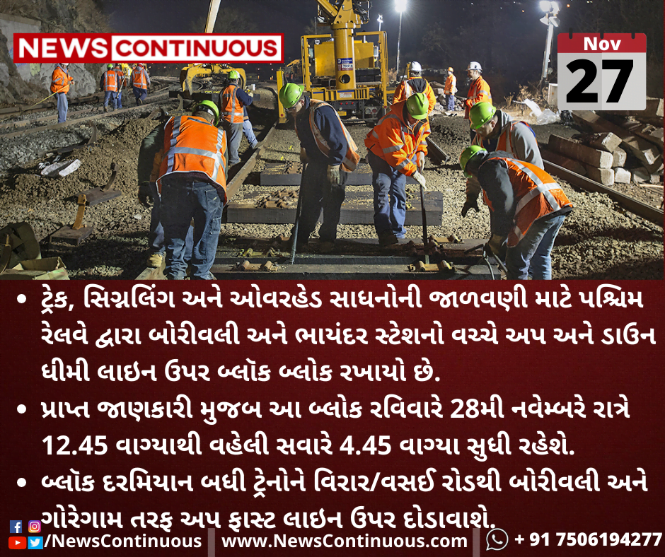 ટ્રેક, સિગ્નલિંગ અને ઓવરહેડ સાધનોની જાળવણી માટે પશ્ચિમ રેલવે દ્વારા બોરીવલી અને ભાયંદર સ્ટેશનો વચ્ચે અપ અને ડાઉન ધીમી લાઇન ઉપર બ્લૉક બ્લોક રખાયો છે.