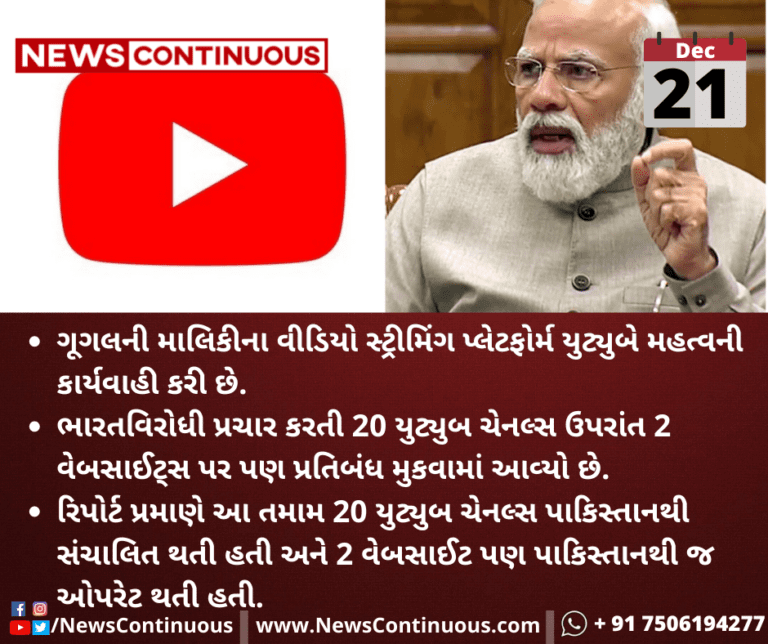 ભારતવિરોધી પ્રચાર કરતી 20 યુટ્યુબ ચેનલ્સ ઉપરાંત 2 વેબસાઈટ્સ પર પણ પ્રતિબંધ મુકવામાં આવ્યો છે.