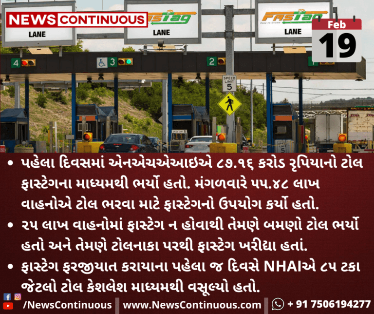 પહેલા દિવસમાં એનએચએઆઇએ ૮૭.૧૬ કરોડ રૃપિયાનો ટોલ ફાસ્ટેગના માધ્યમથી ભર્યો હતો. મંગળવારે ૫૫.૪૮ લાખ વાહનોએ ટોલ ભરવા માટે ફાસ્ટેગનો ઉપયોગ કર્યો હતો.