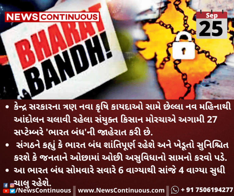 કેન્દ્ર સરકારના ત્રણ નવા કૃષિ કાયદાઓ સામે છેલ્લા નવ મહિનાથી આંદોલન ચલાવી રહેલા સંયુક્ત કિસાન મોરચાએ અગામી 27 સપ્ટેમ્બરે 'ભારત બંધ'ની જાહેરાત કરી છે.