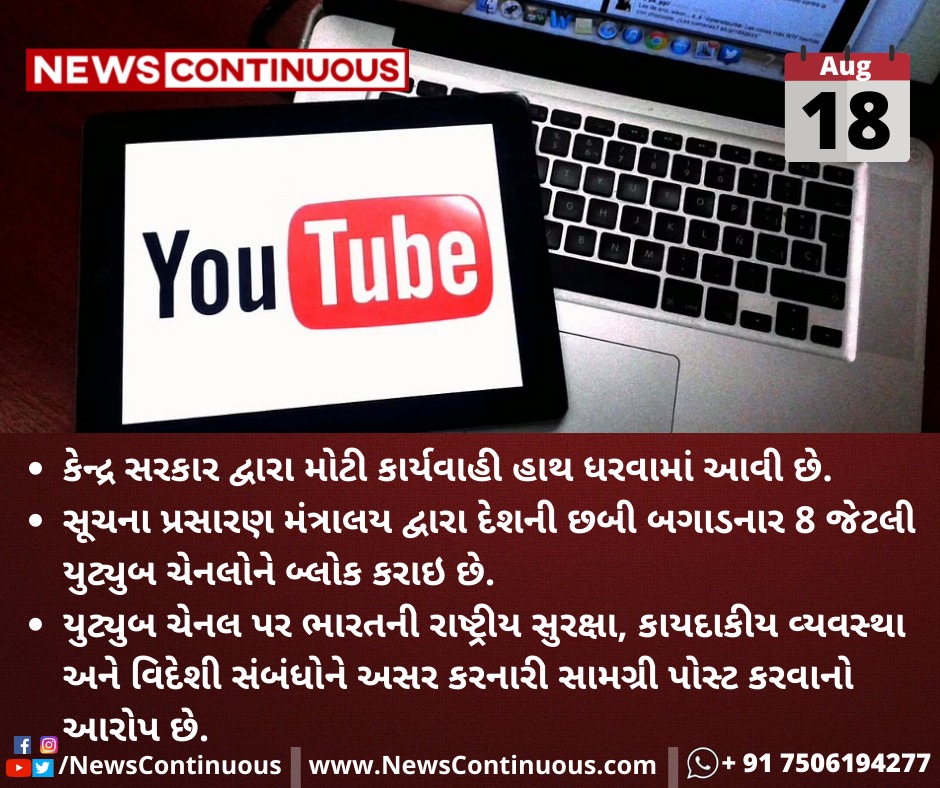 સૂચના પ્રસારણ મંત્રાલય(Ministry of Information Broadcasting) દ્વારા દેશની છબી બગાડનાર 8 જેટલી યુટ્યુબ ચેનલોને(YouTube channels) બ્લોક(Block) કરાઇ છે.