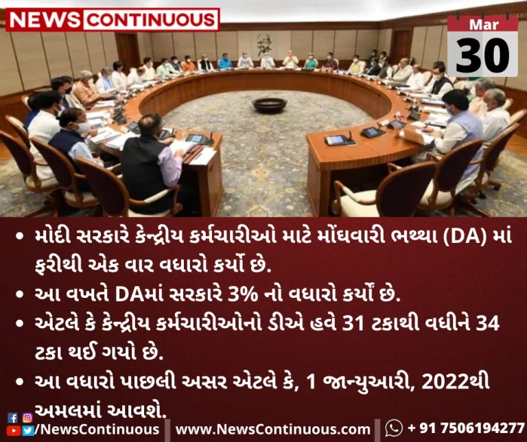 અગાઉ ઓક્ટોબર 2021 માં કેન્દ્ર સરકારના કર્મચારીઓનો DA 28% થી વધારીને 31% કરવાનો નિર્ણય લેવામાં આવ્યો હતો.