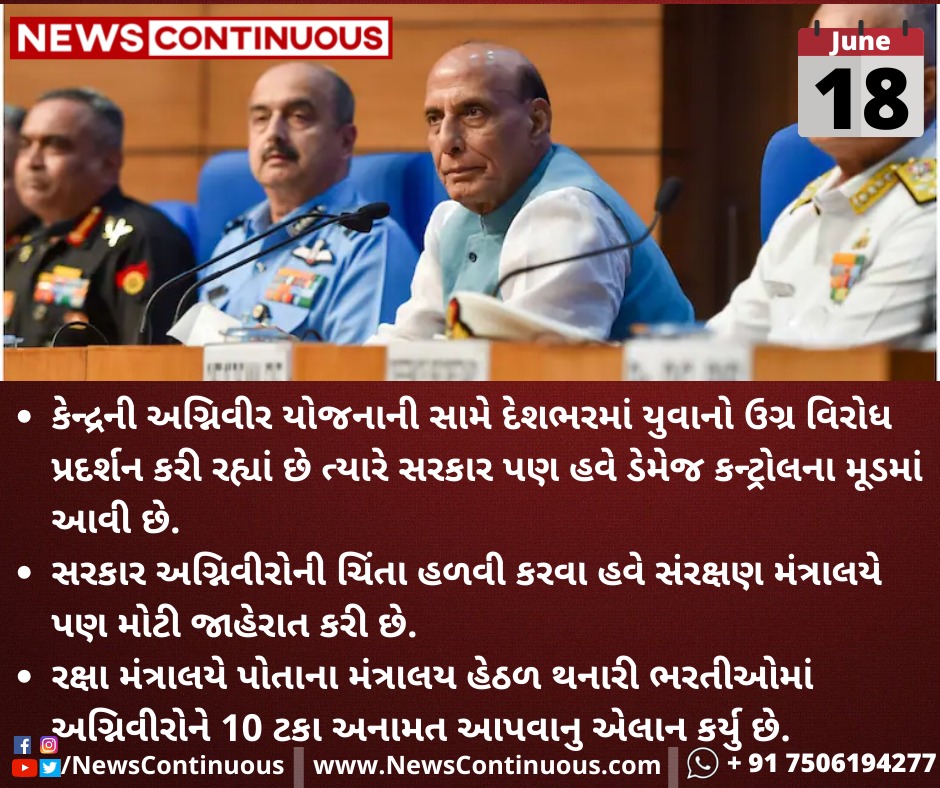 કેન્દ્રની(Central govt) અગ્નિવીર યોજનાની(Agniveer Yojana) સામે દેશભરમાં યુવાનો(Youth) ઉગ્ર વિરોધ પ્રદર્શન(Protest) કરી રહ્યાં છે ત્યારે સરકાર પણ હવે ડેમેજ કન્ટ્રોલના(damage control) મૂડમાં આવી છે.