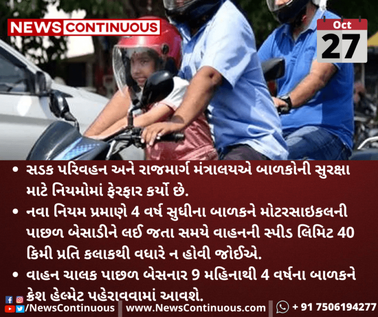 નવા નિયમ પ્રમાણે 4 વર્ષ સુધીના બાળકને મોટરસાઇકલની પાછળ બેસાડીને લઈ જતા સમયે વાહનની સ્પીડ લિમિટ 40 કિમી પ્રતિ કલાકથી વધારે ન હોવી જોઈએ.