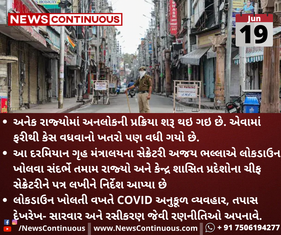 આ દરમિયાન ગૃહ મંત્રાલયના સેક્રેટરી અજય ભલ્લાએ લોકડાઉન ખોલવા સંદર્ભે તમામ રાજ્યો અને કેન્દ્ર શાસિત પ્રદેશોના ચીફ સેક્રેટરીને પત્ર લખીને નિર્દેશ આપ્યા છે