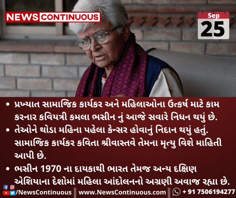 પ્રખ્યાત સામાજિક કાર્યકર અને મહિલાઓના ઉત્કર્ષ માટે કામ કરનાર કવિયત્રી કમલા ભસીન નું આજે સવારે નિધન થયું છે.