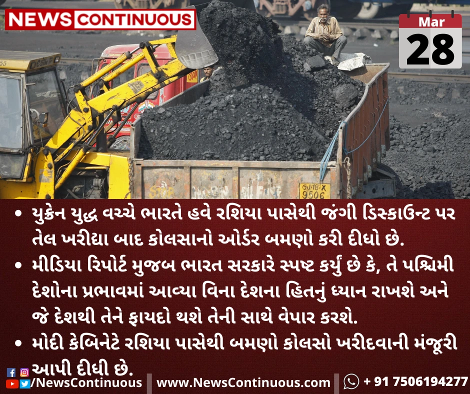 યુક્રેન યુદ્ધ વચ્ચે ભારતે હવે રશિયા પાસેથી જંગી ડિસ્કાઉન્ટ પર તેલ ખરીદ્યા બાદ કોલસાનો ઓર્ડર બમણો કરી દીધો છે.