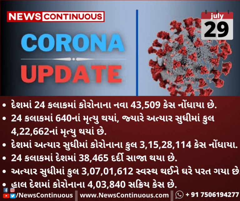 દેશમાં 24 કલાકમાં કોરોનાના નવા 43,509 કેસ નોંધાયા છે.