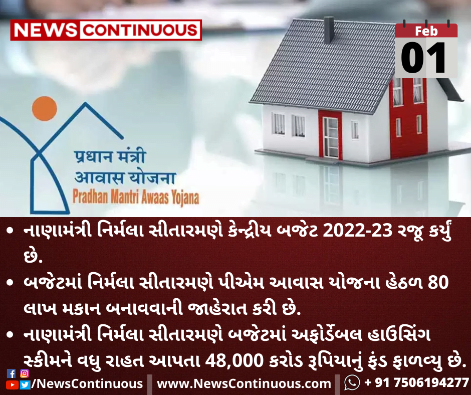 વર્ષ 2022-23ના બજેટમાં નિર્મલા સીતારમણે પીએમ આવાસ યોજના હેઠળ 80 લાખ મકાન બનાવવાની જાહેરાત કરી છે.