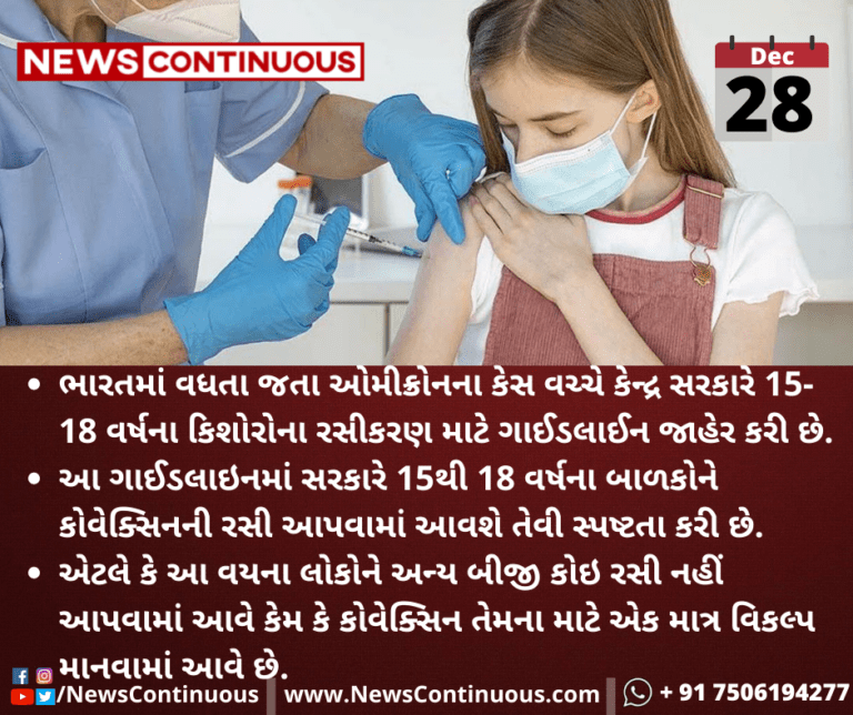 ભારતમાં વધતા જતા ઓમીક્રોનના કેસ વચ્ચે કેન્દ્ર સરકારે 15-18 વર્ષની વય જૂથના કિશોરોના રસીકરણ માટે ગાઈડલાઈન જાહેર કરી છે.