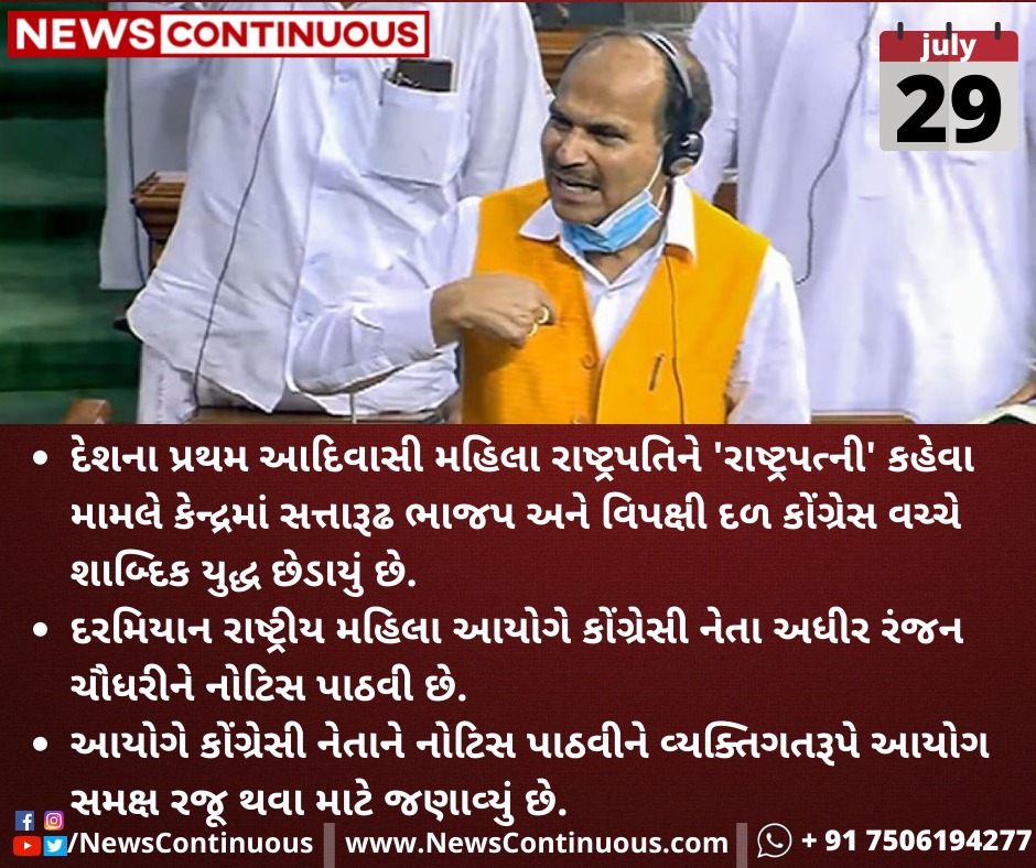 દરમિયાન રાષ્ટ્રીય મહિલા આયોગે(National Commission for Women) કોંગ્રેસી નેતા(Congress leader) અધીર રંજન ચૌધરીને(Adhir Ranjan Chaudhary) નોટિસ પાઠવી છે.