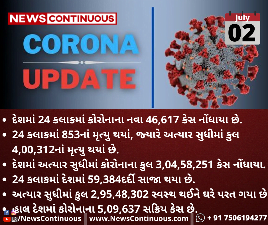 દેશમાં 24 કલાકમાં કોરોનાના નવા 46,617 કેસ નોંધાયા છે.