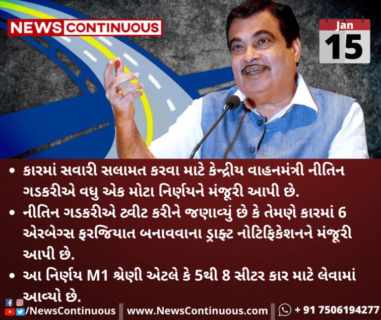 નીતિન ગડકરીએ ટ્વીટ કરીને જણાવ્યું છે કે તેમણે કારમાં 6 એરબેગ્સ ફરજિયાત બનાવવાના ડ્રાફ્ટ નોટિફિકેશનને મંજૂરી આપી દીધી છે.