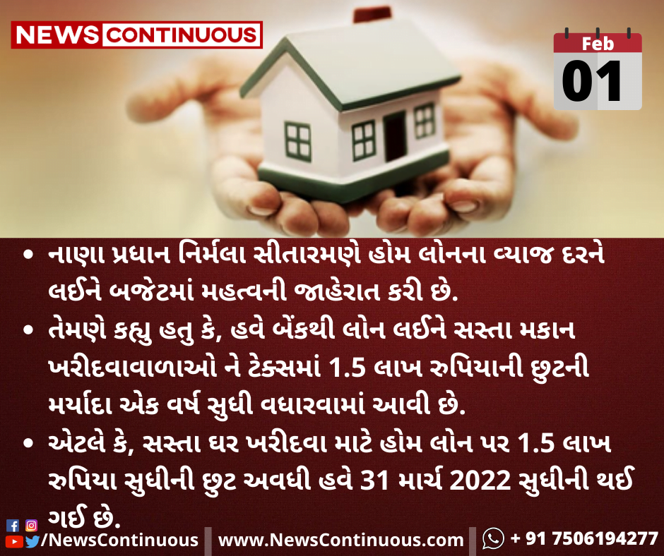 નાણાપ્રધાન નિર્મલા સીતારમણે હોમ લોનના વ્યાજ દરને લઈને બજેટમાં મહત્વની જાહેરાત કરી છે.