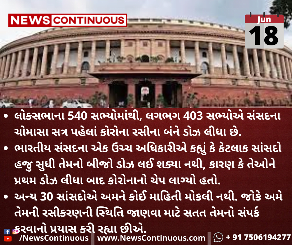લોકસભાના 540 સભ્યોમાંથી, લગભગ 403 સભ્યોએ સંસદના ચોમાસા સત્ર પહેલાં કોરોના રસીના બંને ડોઝ લીધા છે.