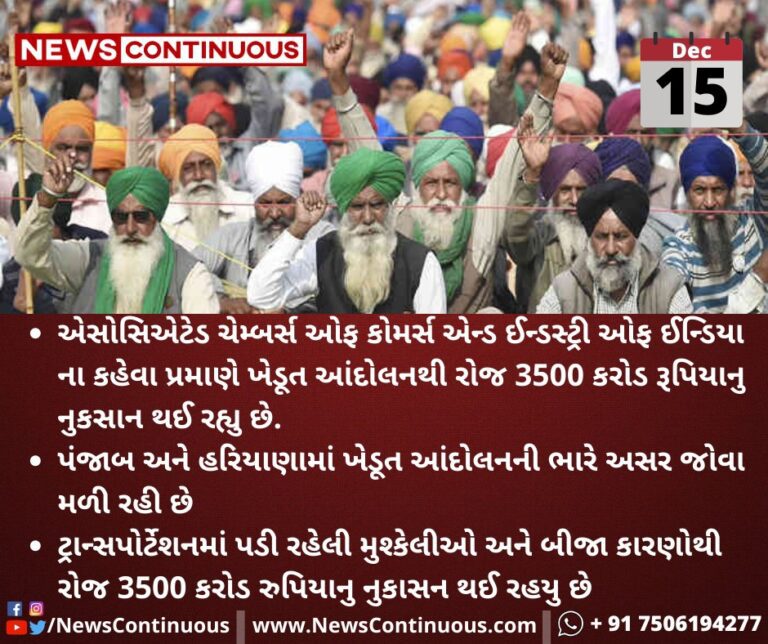 એસોસીએટેડ ચેમ્બર ઓફ કોમર્સ એન્ડ ઇન્ડસ્ટ્રી of ઓફ ઇન્ડિયા ના કહેવા પ્રમાણે ખેડૂત આંદોલન થી રોજ 3500 કરોડ રૂપિયાનું નુકસાન થઈ રહ્યું છે