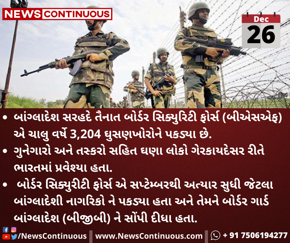 - બાંગ્લાદેશ સરહદે તૈનાત બોર્ડર સિક્યુરિટી ફોર્સ (બીએસએફ) એ ચાલુ વર્ષે 3,204 ઘુસણખોરોને પકડ્યા છે.