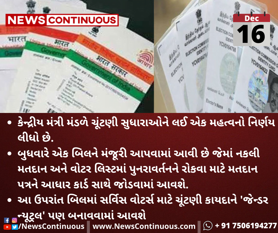 બુધવારે એક બિલને મંજૂરી આપવામાં આવી છે જેમાં નકલી મતદાન અને વોટર લિસ્ટમાં પુનરાવર્તનને રોકવા માટે મતદાન પત્રને આધાર કાર્ડ સાથે જોડવામાં આવશે.