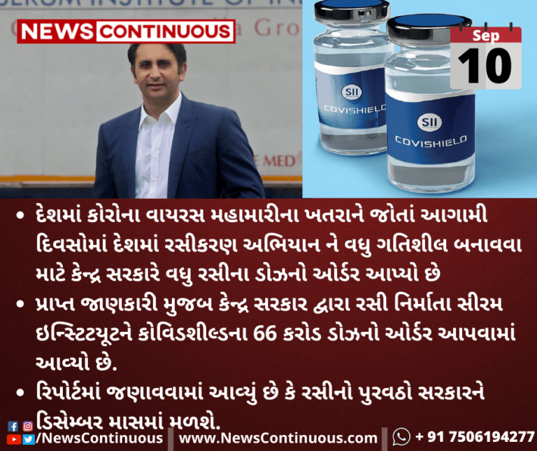 પ્રાપ્ત જાણકારી મુજબ કેન્દ્ર સરકાર દ્વારા રસી નિર્માતા સીરમ ઇન્સ્ટિટયૂટને કોવિડશીલ્ડના 66 કરોડ ડોઝનો ઓર્ડર આપવામાં આવ્યો છે.
