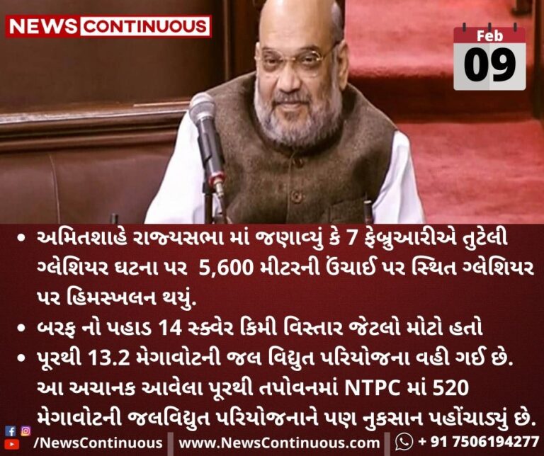 અમિત શાહે રાજ્યસભા માં જણાવ્યું કે 7 ફેબ્રુઆરીએ તુટેલી ગ્લેશિયર ઘટના પર 5,600 મીટરની ઉંચાઈ પર સ્થિત ગ્લેશિયર પર હિમસ્ખલન થયું.