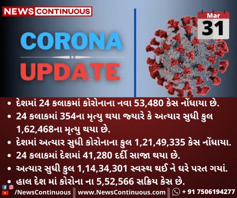 - દેશમાં 24 કલાકમાં કોરોનાના નવા 53,480 કેસ નોંધાયા છે.