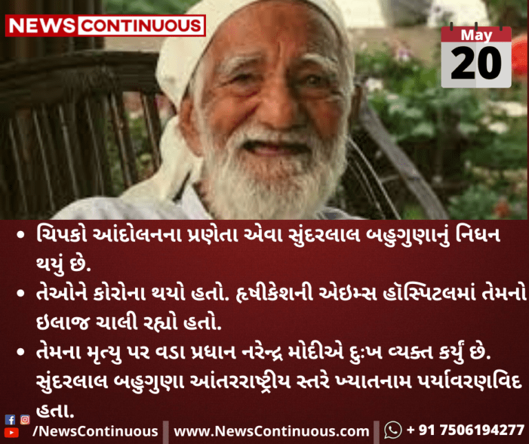 ચિપકો આંદોલનના પ્રણેતા એવા સુંદરલાલ બહુગુણાનું નિધન થયું છે.