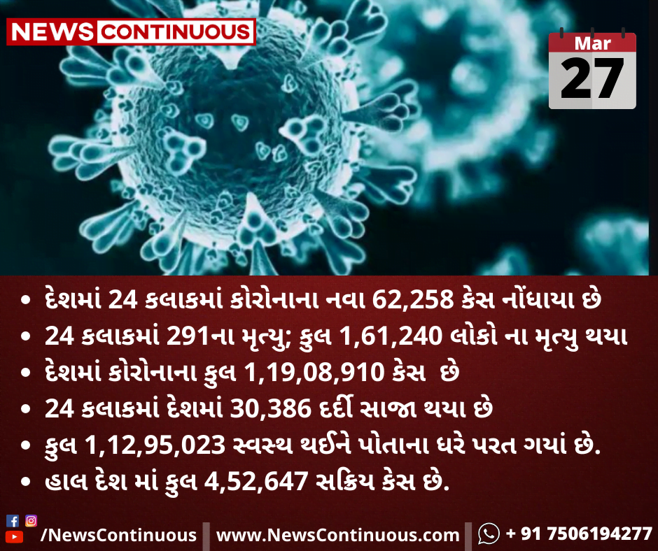 - દેશમાં 24 કલાકમાં કોરોનાના નવા 62,258 કેસ નોંધાયા છે