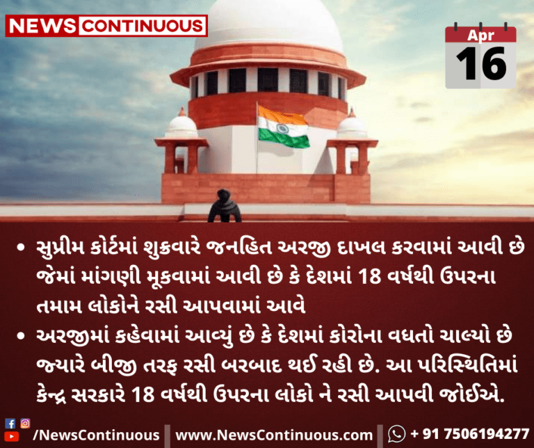 - સુપ્રીમ કોર્ટમાં શુક્રવારે જનહિત અરજી દાખલ કરવામાં આવી છે જેમાં માંગણી મૂકવામાં આવી છે કે દેશમાં 18 વર્ષથી ઉપરના તમામ લોકોને રસી આપવામાં આવે