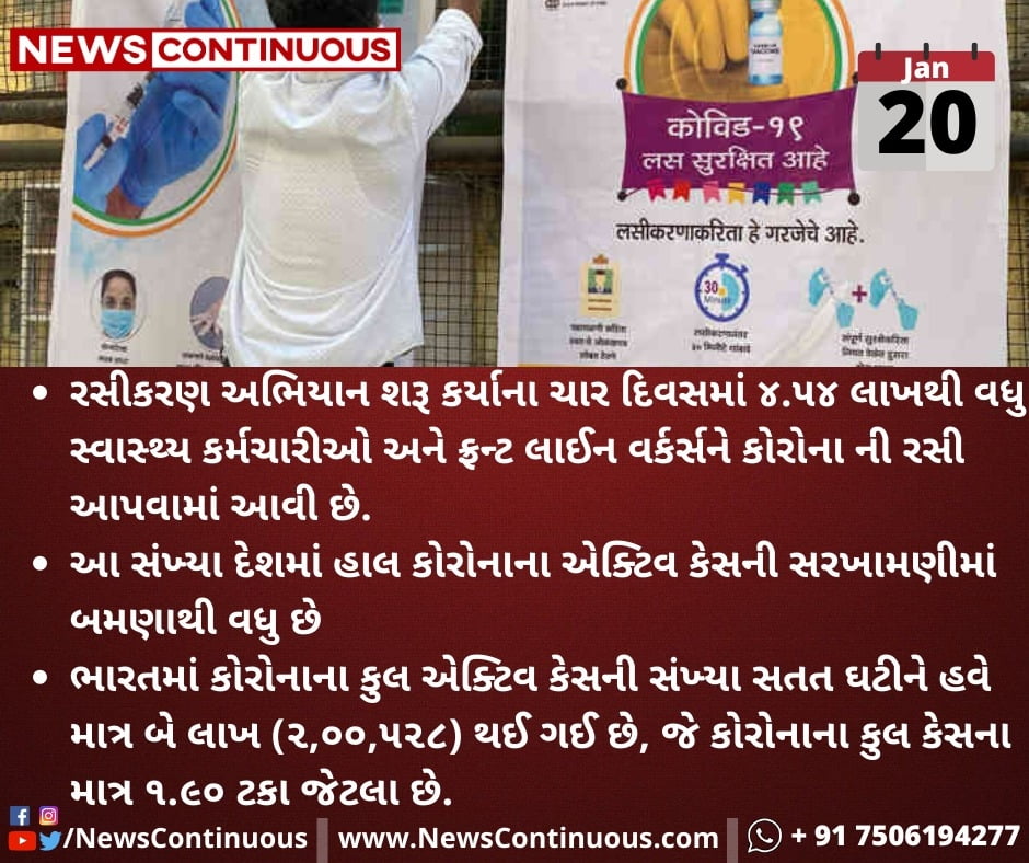 રસીકરણ અભિયાન શરૂ કર્યાના ચાર દિવસમાં ૪.૫૪ લાખથી વધુ સ્વાસ્થ્ય કર્મચારીઓ અને ફ્રન્ટ લાઈન વર્કર્સને કોરોના ની રસી આપવામાં આવી છે.