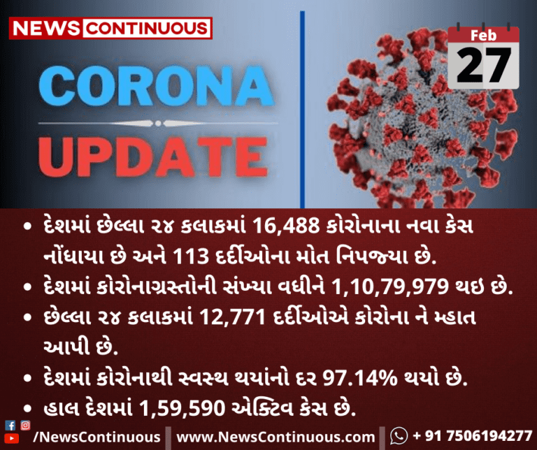 દેશમાં છેલ્લા ૨૪ કલાકમાં 16,488 કોરોનાના નવા કેસ નોંધાયા છે અને 113 દર્દીઓના મોત નિપજ્યા છે.